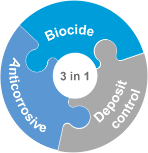 Como consecuencia, a menudo es esencial un tratamiento con biocidas, por ejemplo, en sistemas de refrigeración, papeleras y fábricas de pasta de papel. Los programas de tratamiento tienen que reducir significativamente el contenido bacteriano (TBC) del agua y controlar la formación de biopelículas. Deben tenerse en cuenta los aspectos de minimización de los impactos negativos en el sistema y la compatibilidad medioambiental, como AOX, DQO, degradabilidad y contenido de nitrógeno y fósforo.
